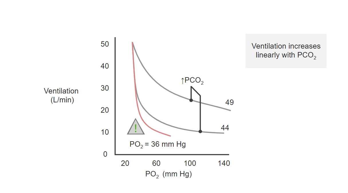 Chart of PO2 (x-axis) and ventilation (y-axis):