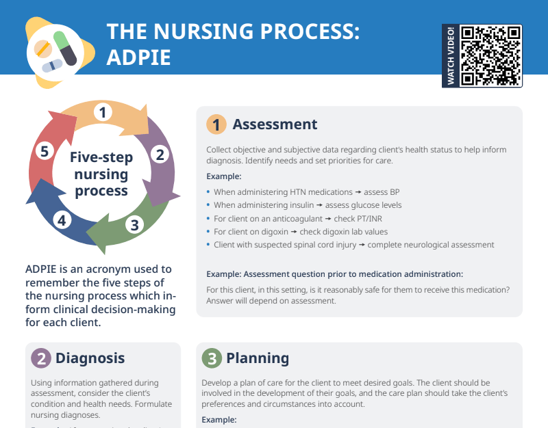 The nursing process is a systematic approach to patient/client care that follows five steps: Assessment, Diagnosis, Planning, Implementation, Evaluation.