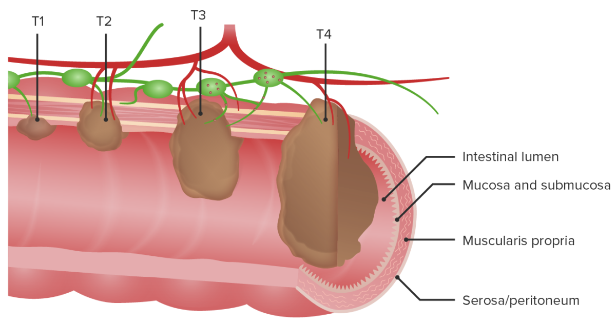 Exemplo de estadiamento T1 – T4 para o tumor do cólon