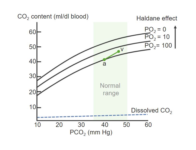 Observe como a PCO 2 aumenta do lado arterial (a) para o lado venoso (v). A curva de dissociação é elevada com a diminuição da PO2 , referindo-se ao facto de que uma baixa concentração de O2 permite que mais CO 2 se ligue à Hb.