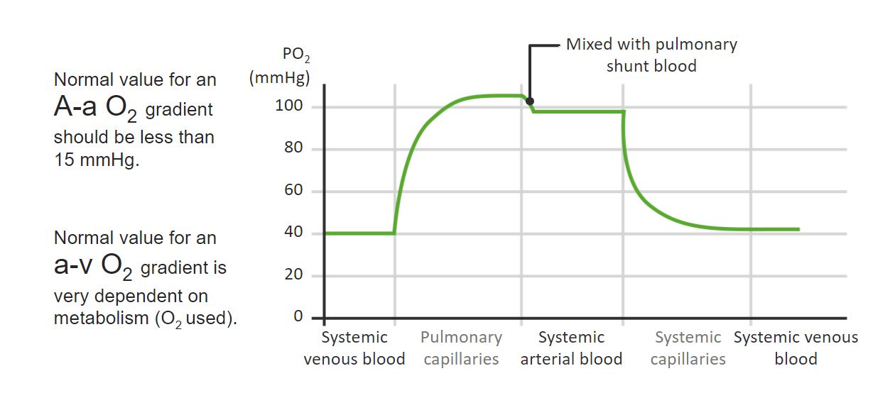Veja o gradiente de Aa no ponto de comunicação entre os capilares pulmonares e a circulação arterial sistémica. O gradiente av seria a diferença entre a PO2 da circulação arterial sistémica antes dos capilares e a PO2 da circulação venosa sistémica após os capilares.